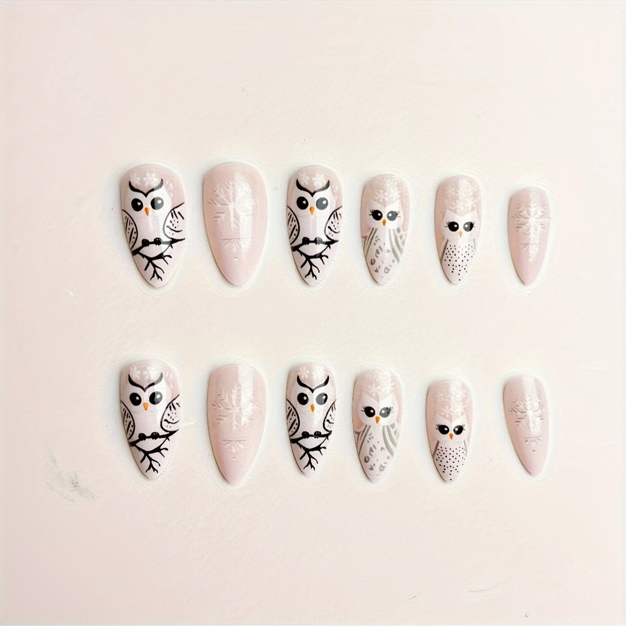 24-Piece Middle Length Glossy Finish Cute Snowflake Owl Design Almond Shaped Press-On Nails Set